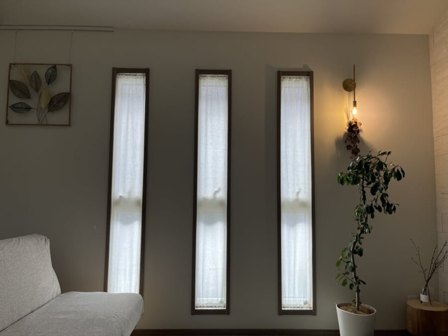 型板ガラスの窓にはカーテンを設置していませんでしたが、多少、外から中が見えることが気になり、カフェカーテンをつけました。