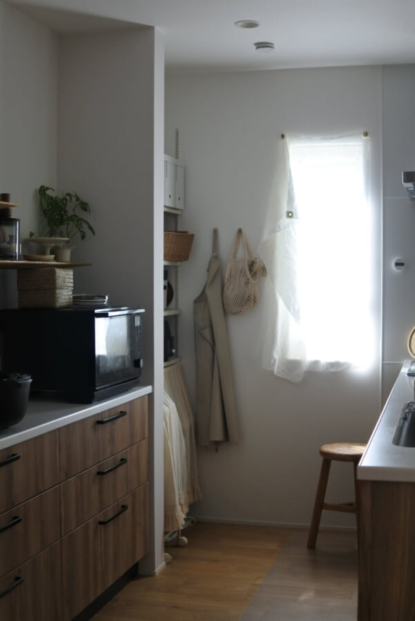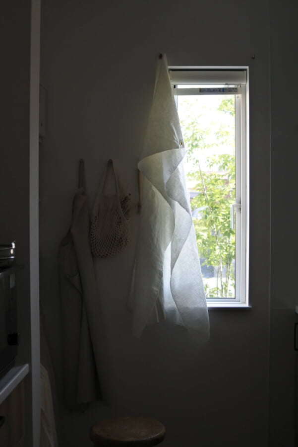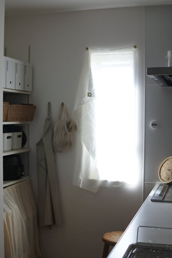 今回選んでいただいたハトメスタイルは、しっかりとカーテンレールを取り付けるほどではないサイズの窓などに適していて、さらりとさりげなく布が掛かっているのが、K様のキッチンの雰囲気にとっても合っていますね!