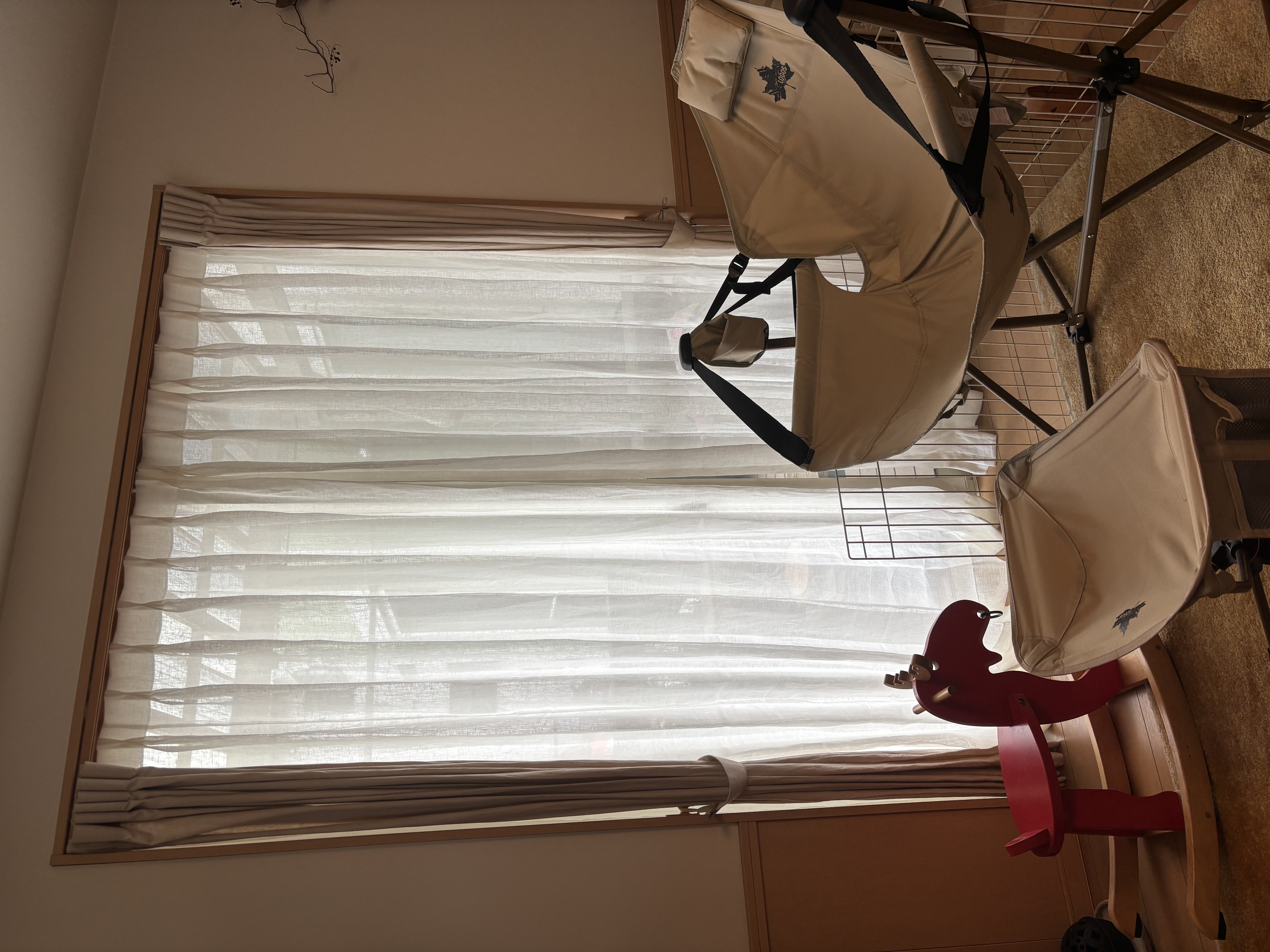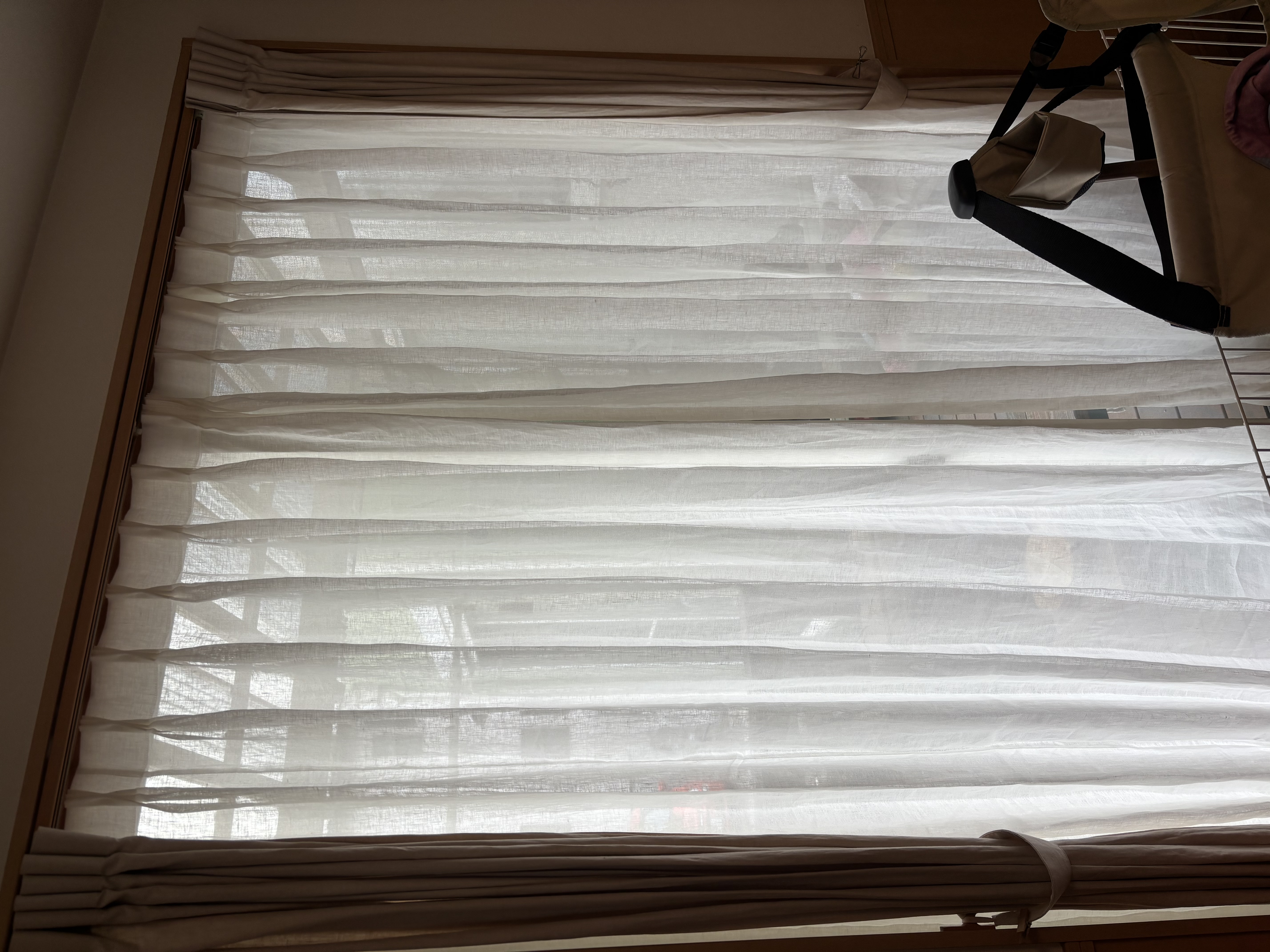 リネンカーテンは適度なシワ感もあるため、前からそこにあったかのように優しく空間に馴染みますよね。レースカーテンの生地も比較的厚みもあるため、外が丸見えなわけではなく、N様が仰るように様子がほんのりわかる程度なので、外よりもリネンカーテン自体に目が留まり見とれてしまいますよね。使い込むことでさらにくたっと馴染んできますので、これからもリネンカーテンのある暮らしをお楽しみください!