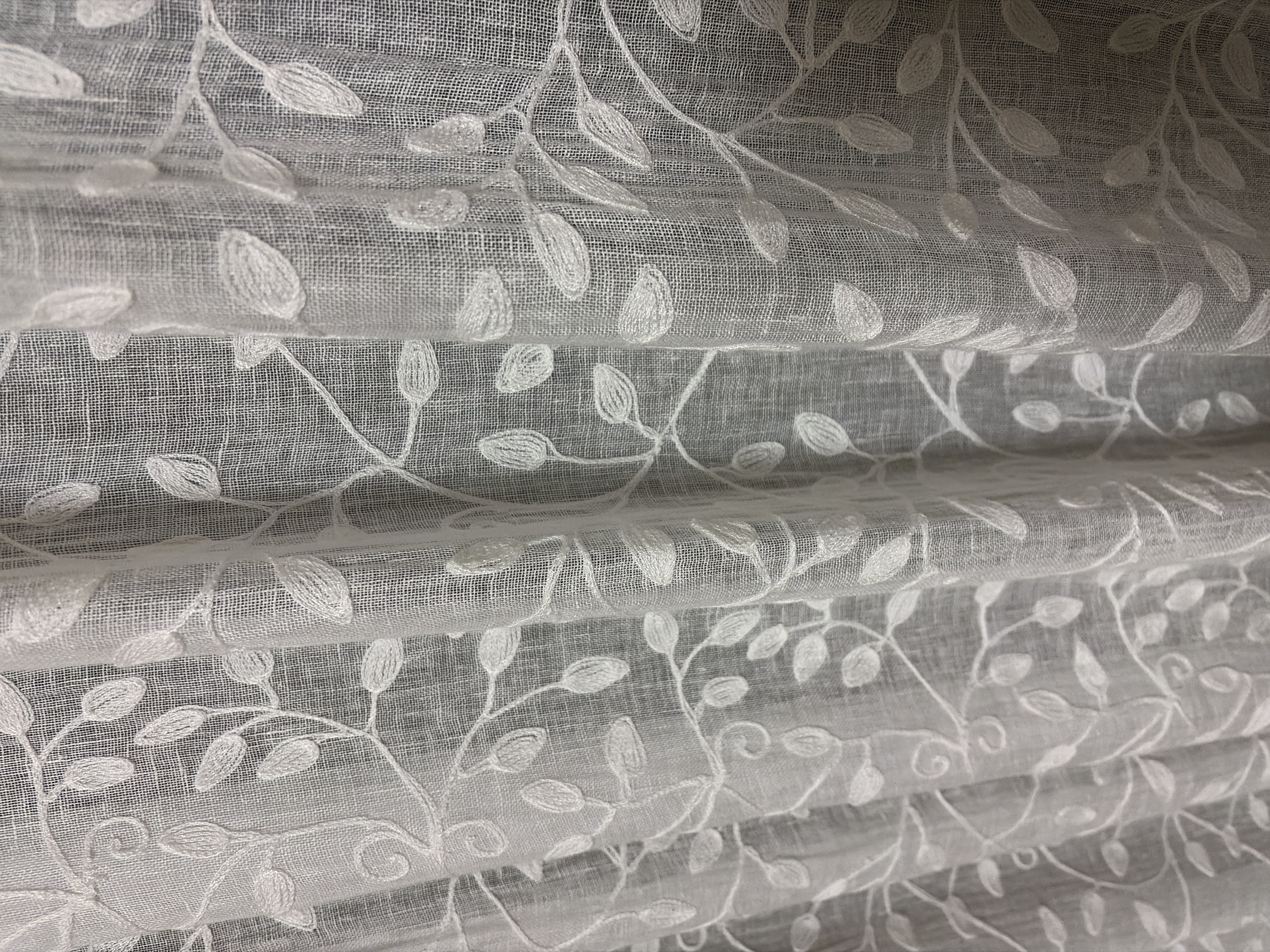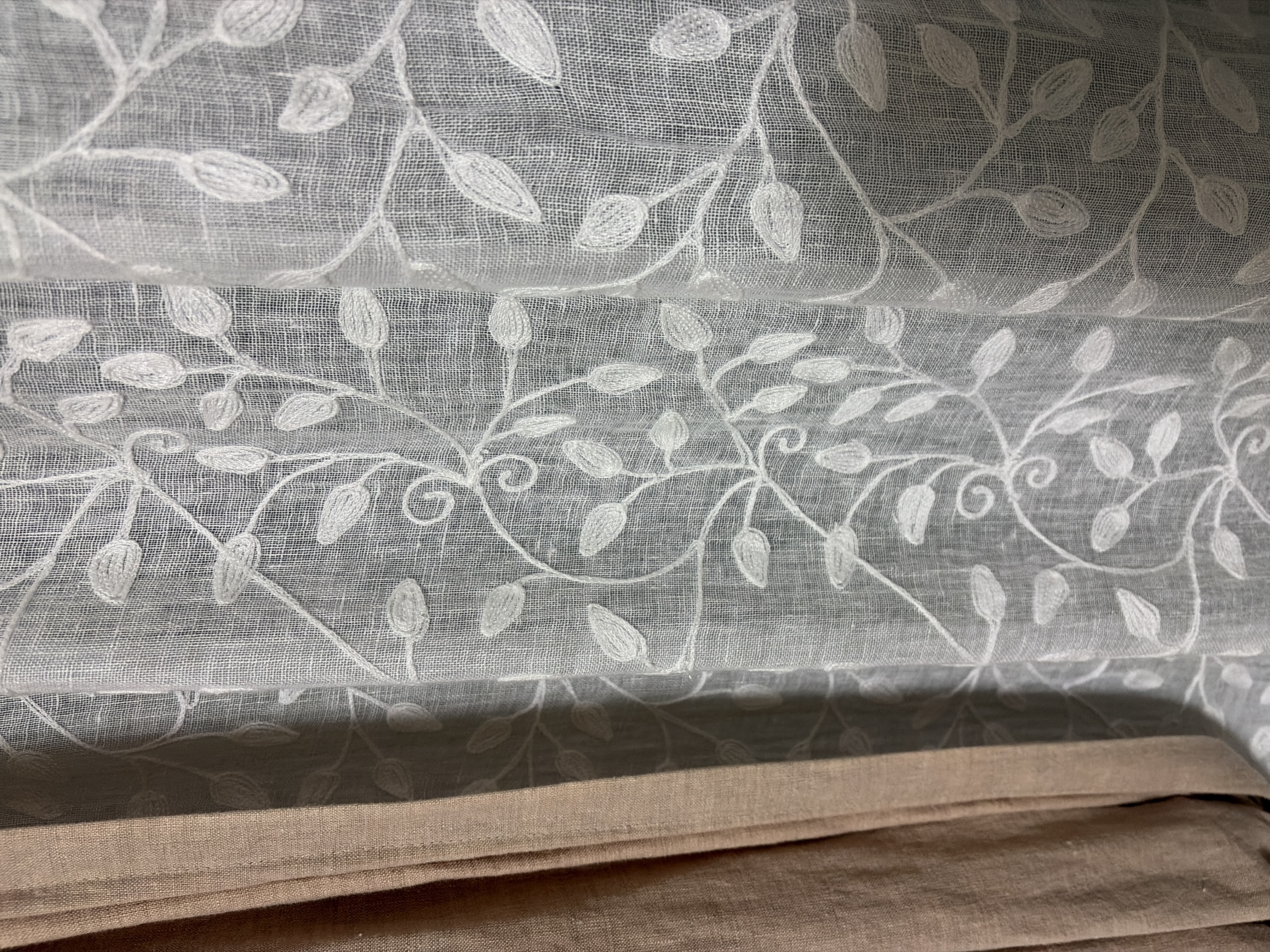 リネンカーテンは最近目にするようになってきましたが、リネンカーテンに刺繍が施されたものは、まだ多くはないかもしれませんね。カーテンを選ぶ際には気に入った柄やお部屋に合ったものという感じで室内から見た時をイメージして選ぶことが多いですが、レースカーテンは日中も夜でも閉めていることが多いので、外からの見え方も大切ですよね。それがこの刺繍のレースカーテンだったらかわいいこと間違いなしですね!これからもリネンカーテンのある暮らしを室内からも室外からもお楽しみいただければ、私たちも幸いです。